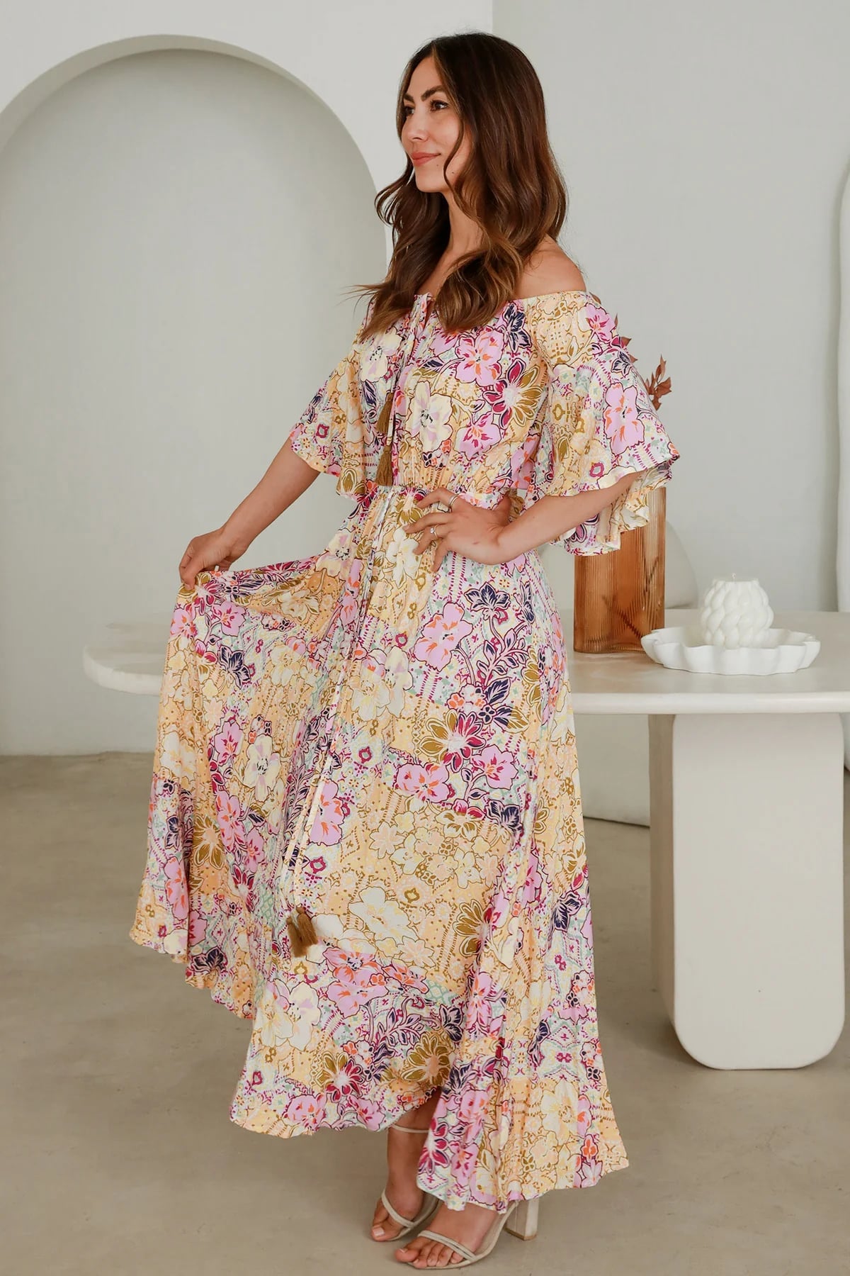 Unleash your flowy floral side with the Eva Off Shoulder Maxi Dress! Embrace the beauty of pastel and multi-coloured blooms in this playful and versatile dress. Perfect for any occasion, this dress will make you feel like a whimsical garden fairy.