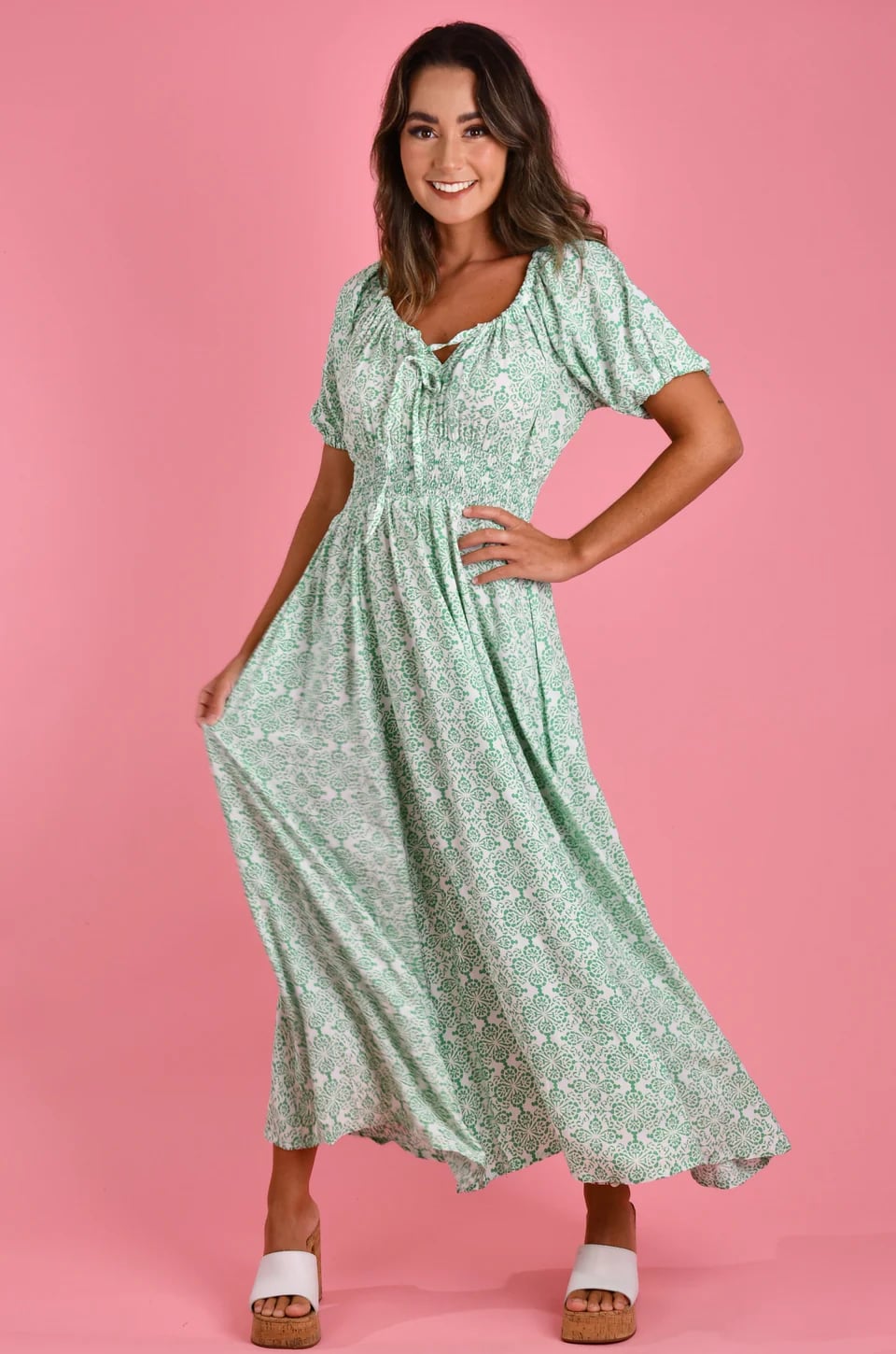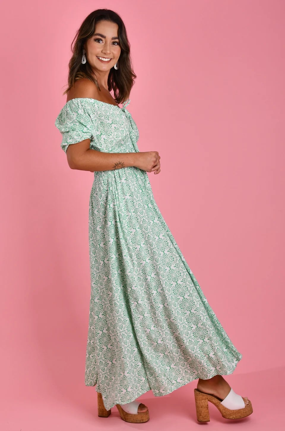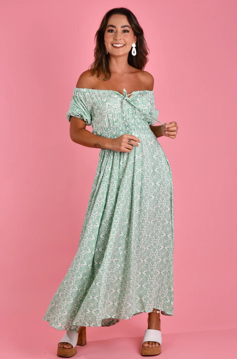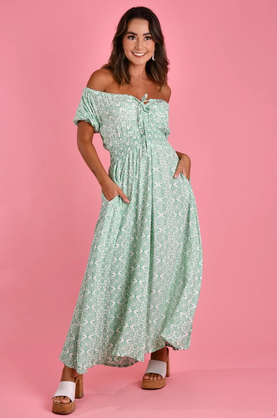 Make a statement in our Paros Maxi Dress! This gorgeous sea green dress features a beautiful pattern and a flirty off shoulder design. Plus, the tie front detail adds an extra touch of charm. Perfect for any occasion, this dress will have you feeling confident and stylish.