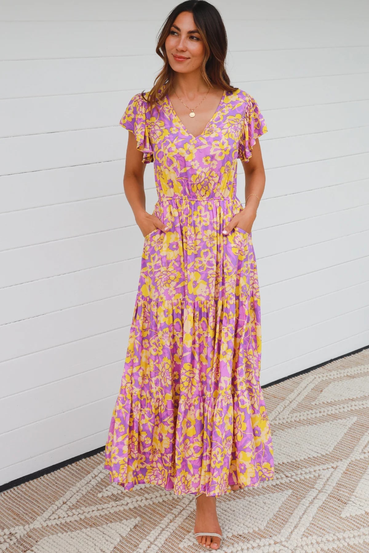 Twirl and swirl in the Penelope Maxi Dress! This flowy, V-neck dress comes in a playful mix of pink and yellow, perfect for summer days. Its short sleeves add a touch of flirtiness. Get ready to turn heads in this whimsical maxi dress!